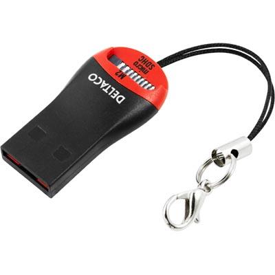 Röd och svart, med hängsnöre. Praktisk liten kortläsare att ha hängande i nyckelknippan för att lägga över musik, böcker och annat till minneskortet på mobiltelefonen.