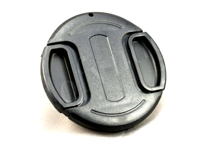Objektivlock eller linsskydd med snap-on och snodd. Tryck in knapparna i sidan eller fram för att frigöra locket.